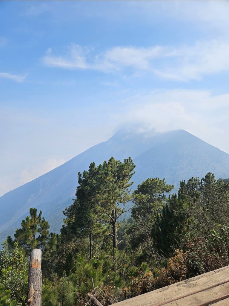 Unser Tag begann früh morgens um 6 Uhr. Zwei Kleinbusse brachten uns zunächst zu einem sehr netten Café in Antigua (Rainbow Café), wo wir ein lokales Frühstück genossen: Maistortilla, schwarze Bohnen, Rühreier und gebackene Banane. Danach fuhren wir nach La Soledad, dem Startpunkt der Wanderung. Dort konnten wir noch Wanderstöcke ausleihen, was ich jedem empfehlen würde, und dann ging es auch schon los – und zwar sofort steil bergauf.