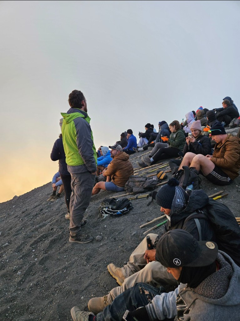 Nach etwa 20 Minuten entschieden ich mit einigen anderen, wieder umzudrehen, da ich extrem erschöpft war. Ich ging mit einigen anderen zurück ins Basecamp und wir sahen den Sonnenaufgang am Lagerfeuer. Nachdem die Gruppe wieder vereint war, frühstückten wir gemeinsam und begannen dann den Abstieg.