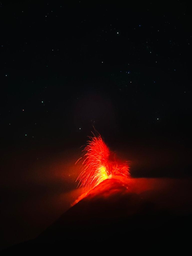 Auf 3.600m angekommen, standen wir sehr nah am Krater des aktiven Vulkans. Es war sehr wolkig, aber der starke Wind blies die Wolken immer wieder weg, sodass wir freie Sicht auf den Krater hatten. Das Gefühl, auf einem Vulkan zu stehen, der in diesem Moment ausbricht, war unbeschreiblich. Der Boden grummelte und wackelte, und die Geräusche sowie die enorme Rußwolke waren atemberaubend. Um den Moment noch besser zu machen, hat unser Guide eine Flasche Rum hervorgezaubert, welche wir dann gemeinsam genossen haben.